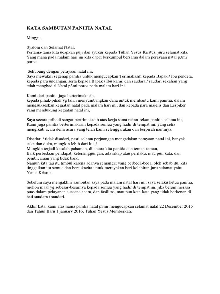 Sambutan ketua panitia natal wkri gereja katolik st petrus stasi hayaping terima kasih kepada pembawa acara telah member. Contoh pidato sambutan ketua panitia 17 agustus bahasa jawa klaten b. Contoh pidato sambutan ketua panitia natal sekolah shalom selamat pagi kepada bapakibu saudara saudari . Sambutan ketua panitia natal gbi phr 2015. Teks pidato sambutan ketua panitia singkat 7 contoh pidato terbaik.